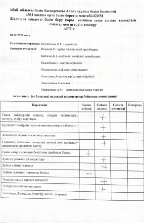 Мектеп сайты » Питание » Мониторинг качества питания » 2024-2025 оқу жылының желтоқсан айы бойынша мектептің бракеражды комиссиясының жалпыға міндетті білім беру қоры есебінен тегін ыстық тамақтың сапасы мен игеруін тексеруі туралы