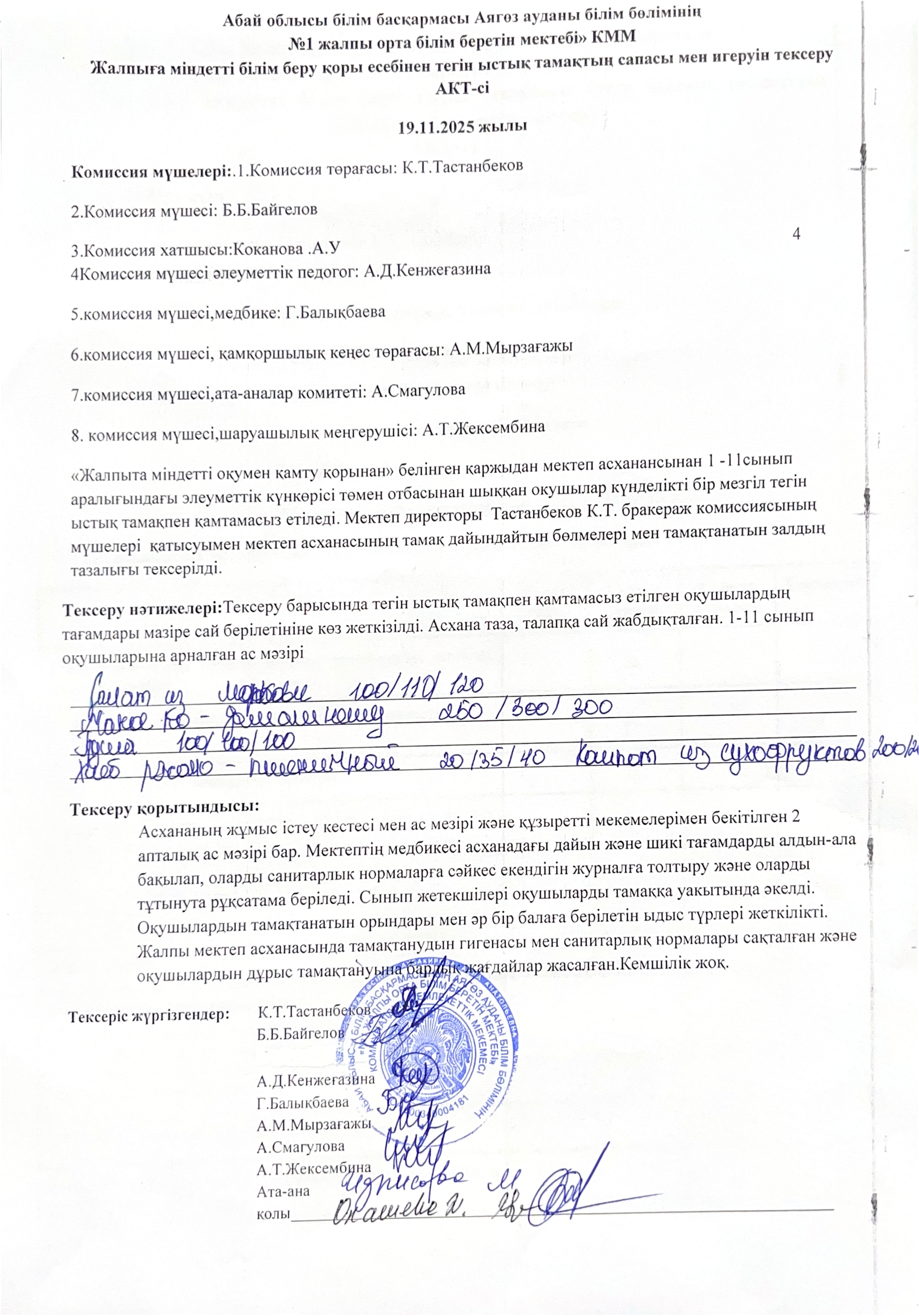 2025 жылдың қараша айының 19 күні Аягөз ауданы білім бөлімі «№1 жалпы орта білім беретін мектебі» КММ-де асханадағы тамақтану сапасын мерзімдік бағалау бойынша бракераж комиссиясы тексеру жүргізді.